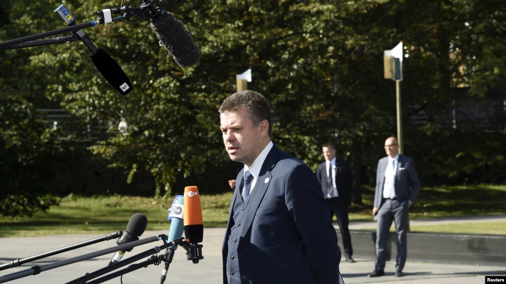 资料照:爱沙尼亚外长雷因萨鲁2019年8月29日在赫尔辛基参加欧盟外长非正式会议时对媒体发表讲话(路透社)。