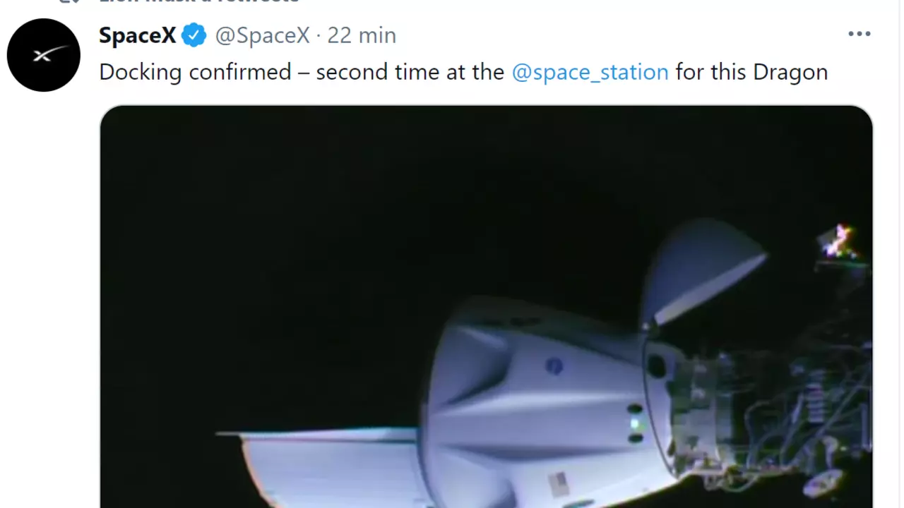 艾隆-马斯克今天早晨发推特说:“对接确认,这条龙是第二次在@空间站对接。”