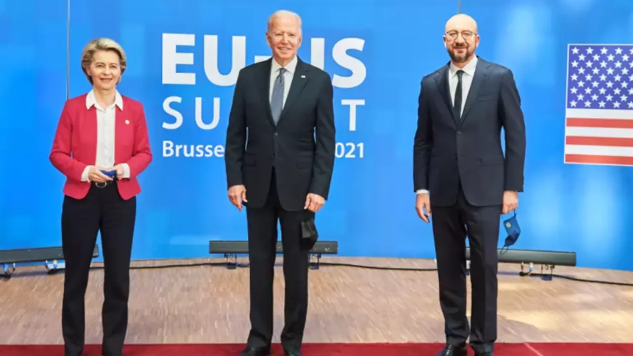 6月15日,美国总统拜登(Joe Biden)在布鲁塞尔与欧盟委员会主席冯德莱恩(Ursula von der Leyen)和欧洲理事会主席米歇尔(Charles Michel)出席了美国欧盟峰会。美欧在会后发表的联合声明中就中国问题表示,“我们打算在我们各自类似的对华多层面方针的框架内,就所有问题进行密切磋商和合作,其中包括合作、竞争和制度性对手的要素。”