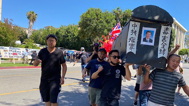 2021年7月1日下午2时,示威者在洛杉矶中领馆外抬棺游行。