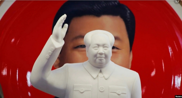 北京天安门附近一个纪念品商店里毛泽东的塑像摆在习近平纪念画盘的前面。(2018年3月1日)