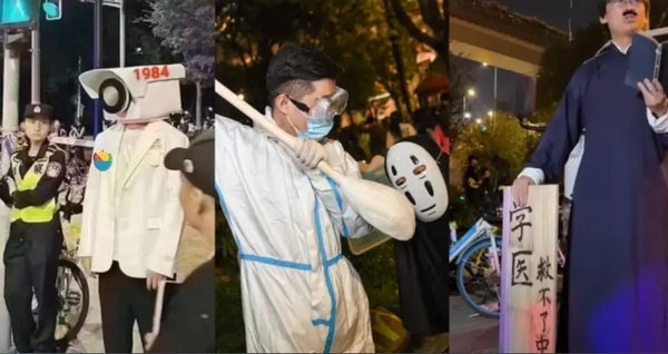 不能否认上海青年的打扮是奇特的,甚至“别有用心”的,你看那一个个曾经肆虐上海的“大白”,那个留着两撇短胡手扶“学医救不了中国人”牌子的“鲁迅”,那个带着口罩、身上贴满白纸的年轻女士,那个手里举着“过除夕”几个大字的男子,那个身着白色西装,被写着1984字样的监控摄像机压没了头脸的人,一切都不言自明。