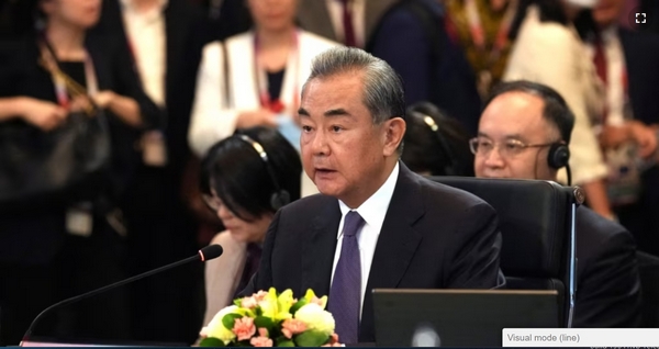 中国外交部长王毅2023年7月13日在东盟外长会议上发言。(媒体联访照片)