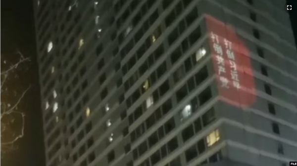 2023年2月21日18时许,济南万达广场高楼外墙突现反习反共投影标语。(柴松提供视频截图)
