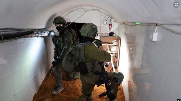 以色列陆军工兵带外国记者穿过了地道。他们进入这个联合国机构大院周边一所学校旁边的竖井,下降到混凝土衬砌的隧道。
