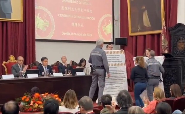 西班牙塞维利亚大学上周一(8日)举行了庆祝孔子学院落成的揭牌仪式。就在与会官员们发言期间出现了一段插曲,该校传播学院副教授莱拉和她的研究助手拉米雷斯各持一个抗议孔子学院的横幅,站到讲台上。之后不久, 他们被安保人员请下台,揭牌活动继续进行。